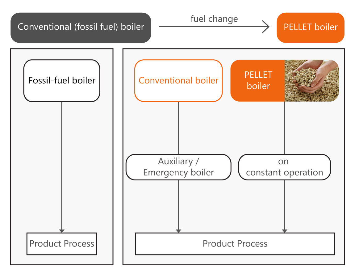 Woodpecker Bioenergy`s conversion of existing fossil fuel system, on energy contract basis, involves investment in energy production facilities using the turnkey principle. The total capex on energy equipment like burners and boilers will be borne by Woodpecker Bioenergy Pvt Ltd. The client only pays for the fuel they use for energy generation. The pellet boiler provided by Woodpecker Bioenergy will be on continuous operation while the existing conventional boiler (fossil fuel) can be kept as an auxiliary/emergency boiler. The savings to the customer will be nearly 30% cheaper compared to diesel oil and LPG, without any investment on capital expenditure.